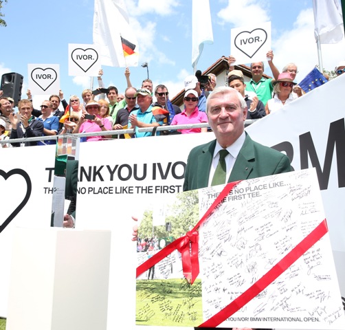 München, 28. Juni 2015 um 12.40 Uhr intonierte Ivor Robson, der Starter der European Tour, zum letzten Mal in seiner unnachahmlichen Start: „On the first tee from...“ Am Ende der Saison wird nach 40 Jahren Schluss sein für die Institution am ersten Abschlag. Die Spieler bedankten sich bei dem Schotten mit einem Erinnerungsbild, das sie unterschrieben und mit persönlichen Widmungen versehen hatte. BMW würdigte Robson mit einer kurzen Zeremonie und den Worten „THANKS IVOR“, die in den Rasen vor dem Tee gemäht worden waren.