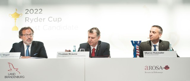 Bei der heutigen Pressekonferenz unterstrichen der Staatssekretär in der Senatsverwaltung für Inneres und Sport des Landes Berlin, Andreas Statzkowski, und der Regierungssprecher des Landes Brandenburg, Thomas Braune, die Bedeutung des Ryder Cup für die beiden Bundesländer. Die deutsche Bewerbung kann sich bei ihrer Kampagne, die sich gegen die Konkurrenz aus Spanien, Portugal, Italien und Österreich durchsetzen muss, auf großen Rückhalt in Politik, Sport und Wirtschaft verlassen.