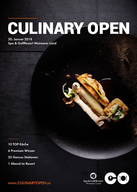 Blankenhain, 09.01.2018. Das Spa & GolfResort Weimarer Land holt für die 1. Culinary Open am 20. Januar 2018 eine ganze Mannschaft von Top-Köchen und -Winzern nach Thüringen. An 29 Stationen werden die Gäste mit Live-Cooking und Premiumweinen begeistert.