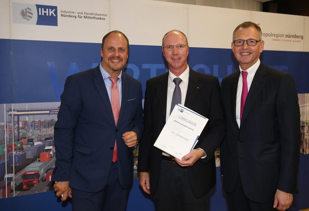Adriaan Alexander Straten wird vom Präsident der Industrie- und Handeskammer Nürnberg für Mittelfranken, Dirk von Vopelius (rechts im Bild), und dem Hauptgeschäftsführer der Industrie- und Handelskammer Nürnberg für Mittelfranken, Markus M. Lötzsch (links im Bild), für seine hervorragenden Verdienste um die berufliche Bildung für 10-jähriges ehrenamtliches Engagement als Prüfer ausgezeichnet.