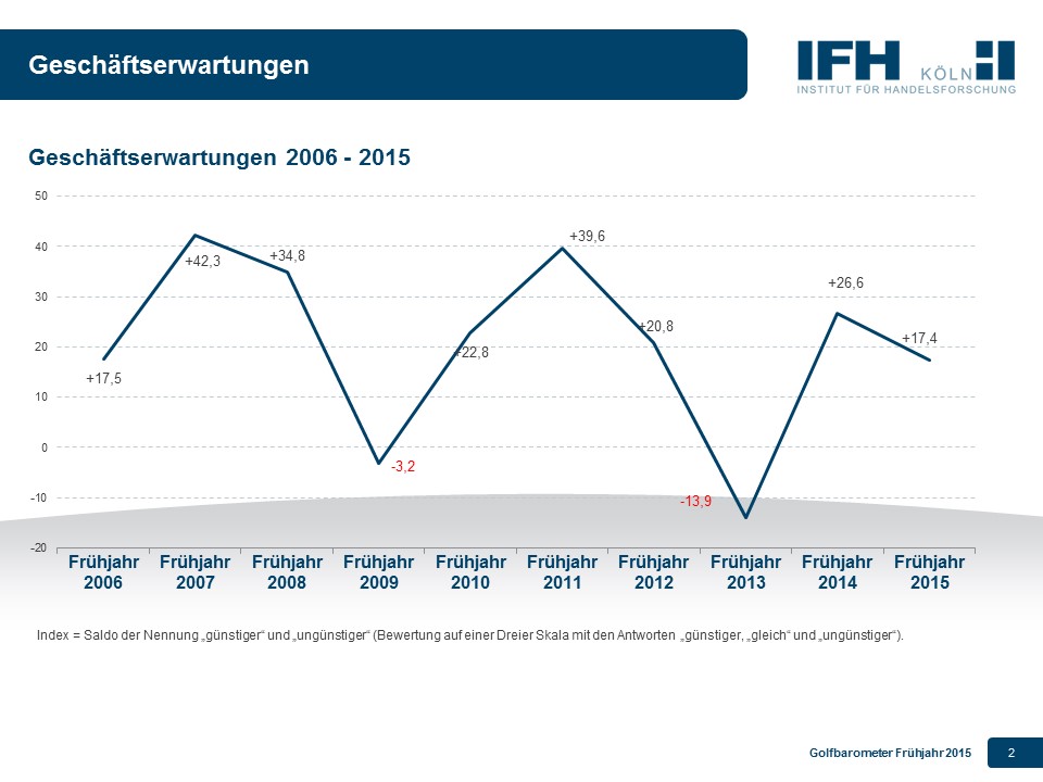 Der durch einen Index ausgedrückte Saldowert des Golfbarometers liegt in den zentralen Kategorien wirtschaftliche Lage, Geschäftserwartungen und Mitgliederentwicklung im positiven Bereich. Mit einem Saldo von +28,4 wird die aktuelle wirtschaftliche Lage sowohl im Vergleich zum Frühjahrs- als auch zum Herbstwert des Vorjahres auf einem höheren Niveau bewertet.