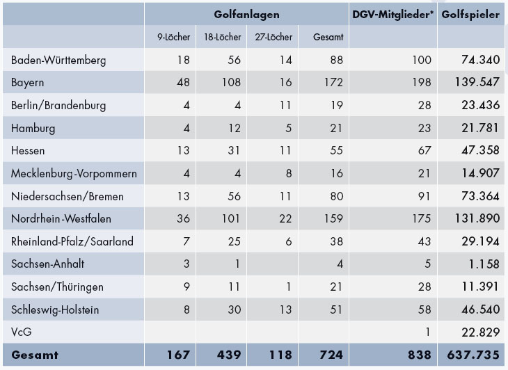 Im Jahr 2013 waren 838 Mitglieder (Golfclubs und Anlagenbetreiber) DGV im organisiert. Darunter 657 eingetragene Vereine (78%) und 181 Kapitalgesellschaften (22%). Fünf neue Golfanlagen ließen die Gesamtzahl der Golfplätze auf nunmehr 724 ansteigen (+0,7%).