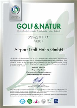 Nach Erfüllung der Basisanforderungen, erhielt die mehrfach ausgezeichnete Airport Golf Hahn GmbH 2011 das „Golf & Natur“ Bronze-Zertifikat. Nun ist ein Jahr vergangen und durch zusätzliche naturverbundene Projekte hat die Airport Golf Hahn GmbH weitere „Golf & Natur“ Ansprüche erfüllt, und bekam am 16. November 2012 das Silber-Zertifikat von Dr. Gunther Hardt, dem Vorsitzenden des Ausschusses Umwelt und Platzpflege des Deutschen Golf Verband e.V. (DGV), überreicht.